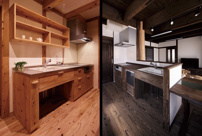 音響熟成木材。食器棚とキッチンの組み合わせ