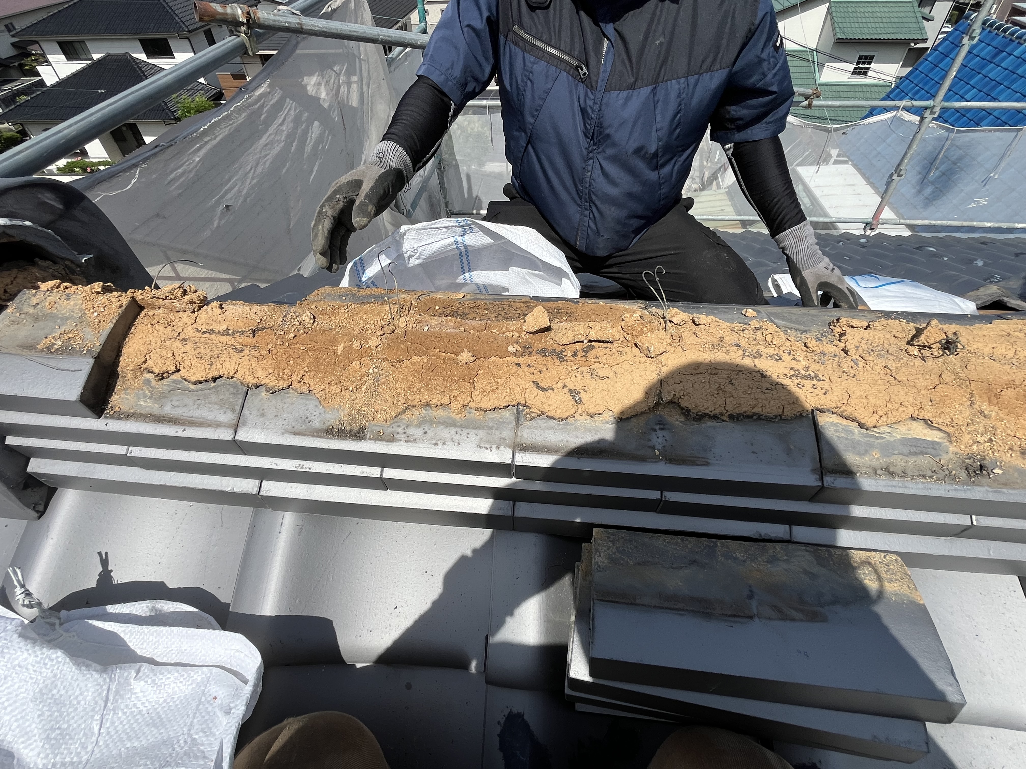 棟部を湿式工法から乾式工法へ、強力棟の取り付けと瓦をビスで固定